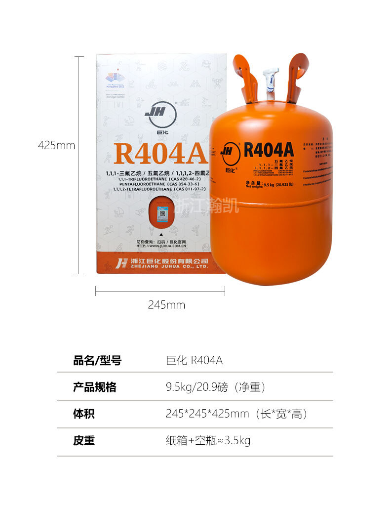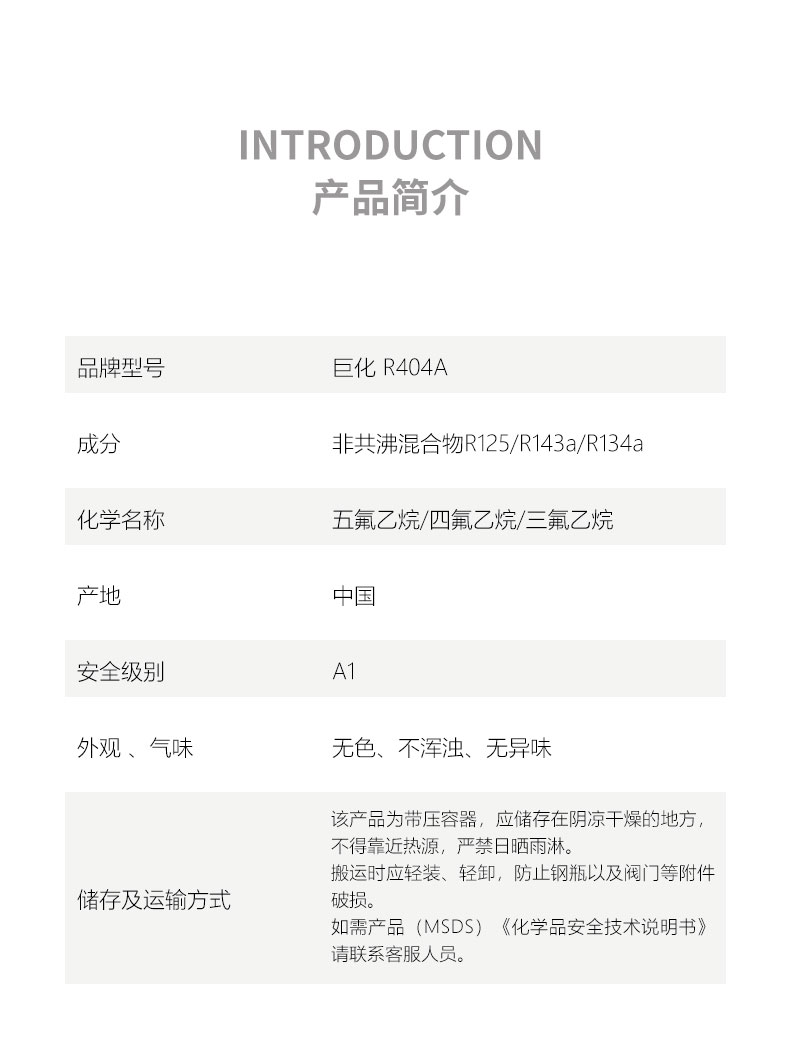 R-404A制冷劑,別名R404A,商品名稱(chēng)有SUVA HP62、SUVA 404A、Genetron 404A等。由于R-404A屬于HFC型非共沸環(huán)保制冷劑(完全不含破壞臭氧層的CFC、HCFC),得到目前絕大多數(shù)國(guó)家的認(rèn)可并推薦的低溫環(huán)保制冷劑,廣泛用于新冷凍設(shè)備上的初裝和維修過(guò)程中的再添加。符合美國(guó)環(huán)保組織EPA、SNAP和UL的標(biāo)準(zhǔn),符合美國(guó)采暖、制冷空調(diào)工程師協(xié)會(huì)(ASHRAE)的A1安全等級(jí)類(lèi)別(對(duì)人身體無(wú)害)。